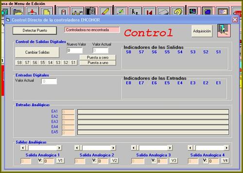 - Permite el control total de la controladora de forma manual mediante botones y barras de desplazamiento en pantalla. Además permite visualizar el valor de las entradas analógicas.